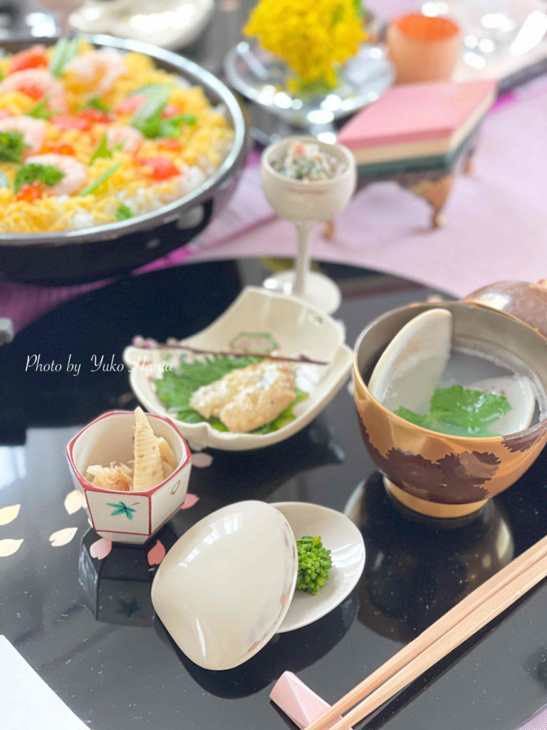行事食なので、毎年変わりばえはしませんが、バラ寿司に、はまぐりのお吸い物、この時期ならではの器たちで、桃の節句を楽しみます。