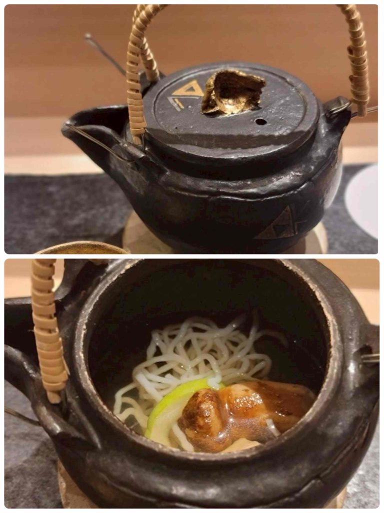 なんと走りの松茸の土瓶蒸し。豊かなお出汁と松茸の香りの贅沢な一品。