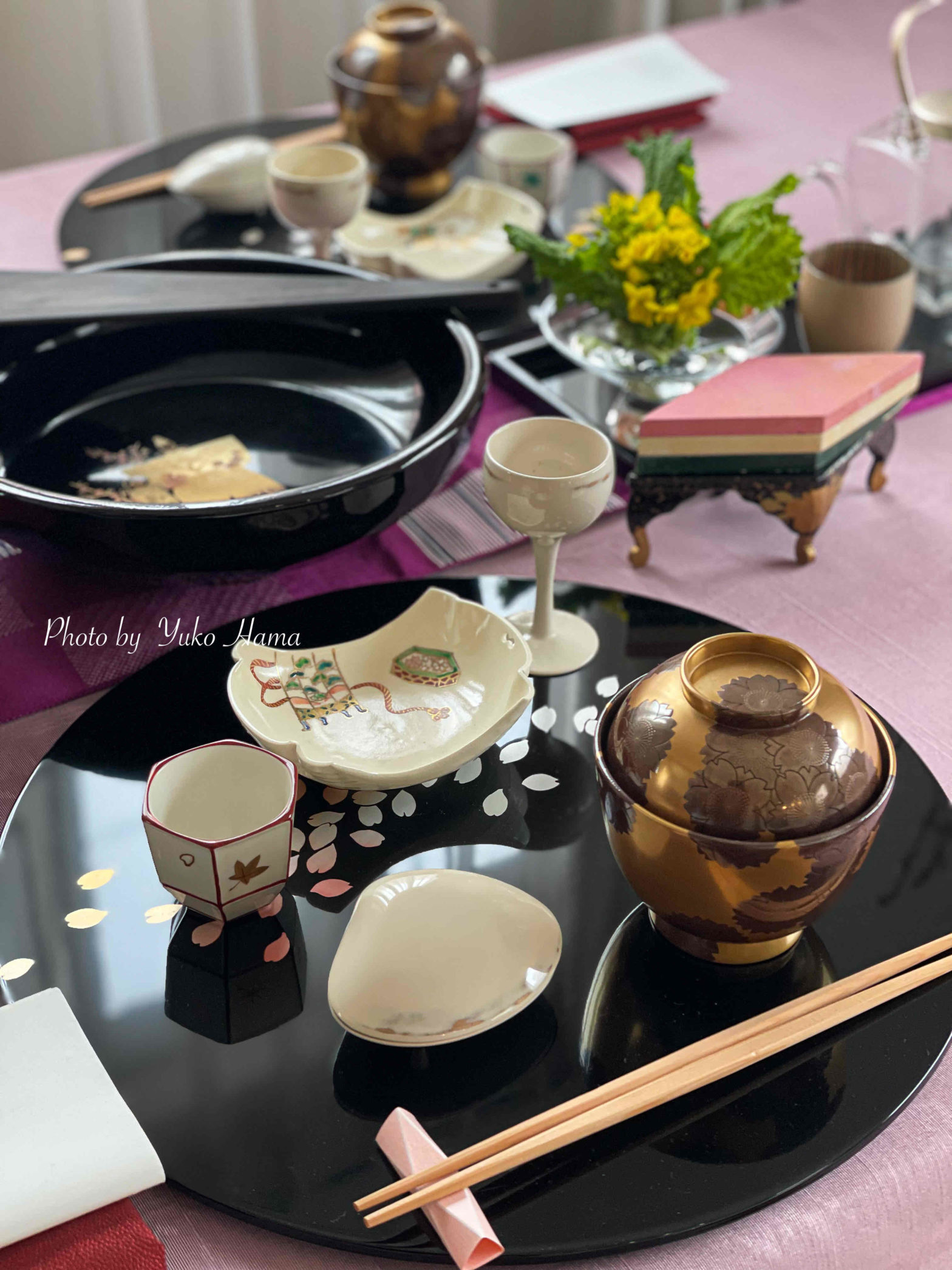 折敷として使っている桜の花びらの蒔絵が施されたプレートは、島安汎工芸製作所さん @shimayasuhankougei