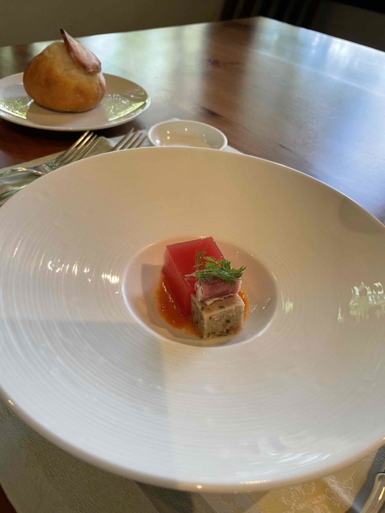 ・スイカのガスパチョゼリーとジャンボンペルシエ(豚のパテゼリー寄せ)